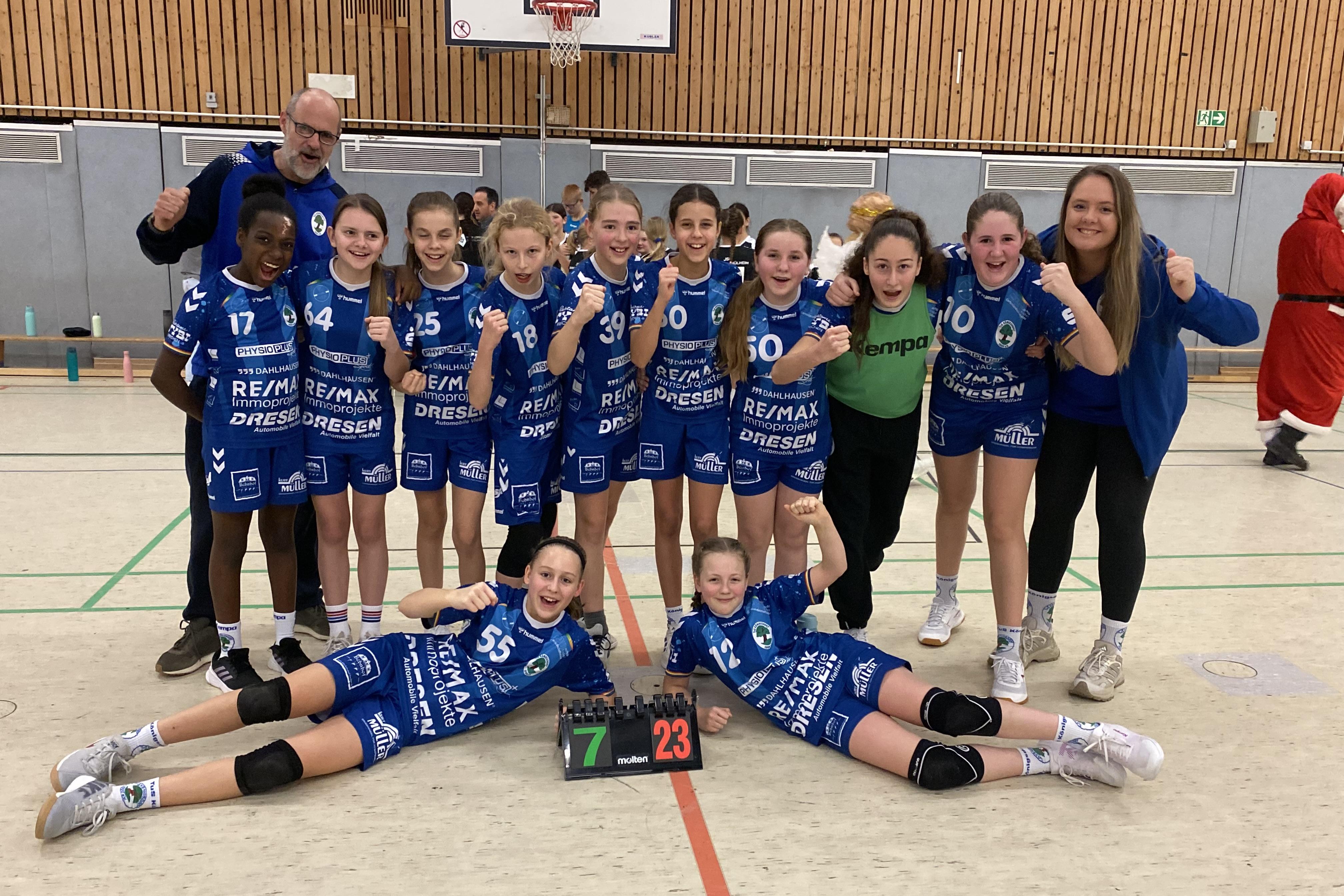 In der Pause herrschte Zufriedenheit bei allen – sowohl bei den Spielerinnen als auch beim Trainerteam. Die Marschroute für die zweite Halbzeit lautete, die herausgespielten Chancen zu nutzen und in der Abwehr weniger als sechs Gegentore zuzulassen. Gesagt, getan: Die Mädchen setzten das Vorhaben um und ließen dem gegnerischen Team kaum Möglichkeiten, zu Abschlüssen zu kommen. Wenn doch mal ein Wurf durchkam, war unsere Torhüterin Esra zur Stelle und unterstützte die Abwehr mit tollen Paraden. Nach 28 Minuten sahen sich die Kölnerinnen erneut gezwungen, eine Auszeit zu nehmen (Spielstand 6:16), doch auch das brachte den TuS Königsdorf nicht aus dem Rhythmus. Die Führung wurde immer weiter ausgebaut und in der zweiten Halbzeit wurde lediglich ein Gegentor zugelassen. Am Ende siegten unsere Mädchen klar mit 7:23 – eine super Leistung zum Jahresabschluss und zum Ende der Hinrunde.