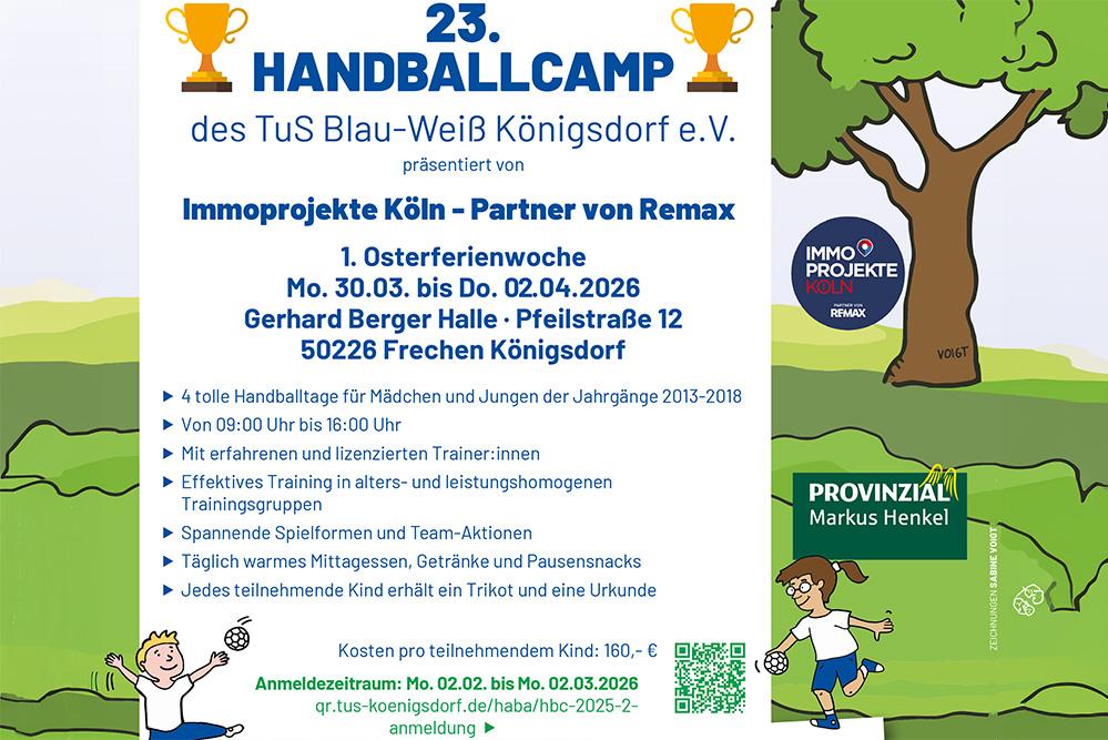 In den Osterferien ist es wieder soweit: Der TuS Blau-Weiß Königsdorf lädt alle handballbegeisterten Mädchen und Jungen der Jahrgänge 2013 bis 2018 zum 23. Handballcamp ein – präsentiert von PROVINZIAL Markus Henkel.